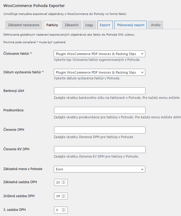 1. V nastavení pluginov (exportérov) v záložke Faktúry si nastavte všetky potrebné údaje, ktoré by mali faktúry v XML výstupoch obsahovať. Toto nastavenie odporúčame odkomunikovať so svojím účtovníkom.
