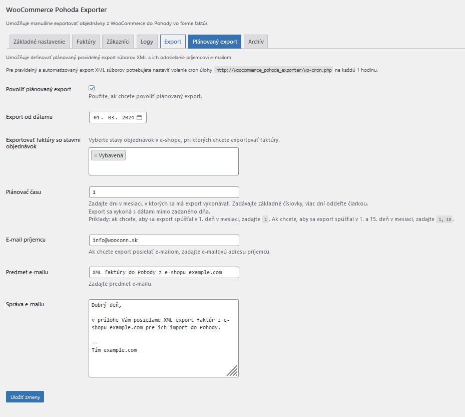 Nemusíte teda manuálne generovať XML faktúry a odosielať ich účtovníkovi, ale stačí v našich pluginoch (exportéroch) správne si nastaviť plánovaný export a pravidelné volanie cron jobu.