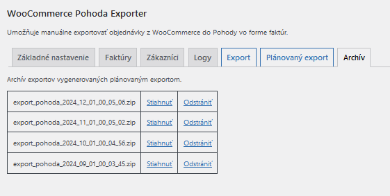 3. V záložke Archív si môžete priebežne sledovať vygenerované XML súbory s možnosťou ich stiahnutia alebo odstránenia.
