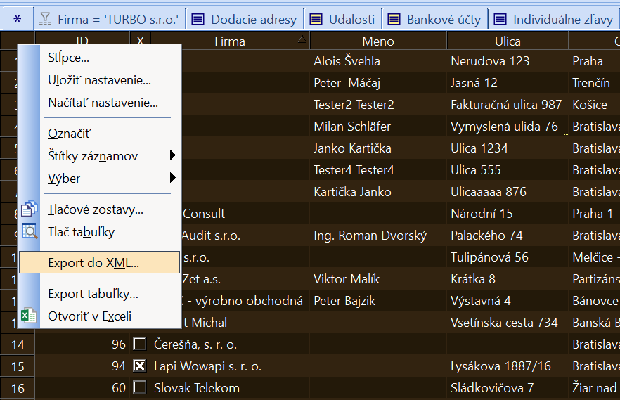 - V Pohode v agende Adresár vykonáte export zákazníkov do XML súboru (vyfiltrujete si tie záznamy, ktoré potrebujete, označíte ich a v ponuke vyberiete Export do XML).
