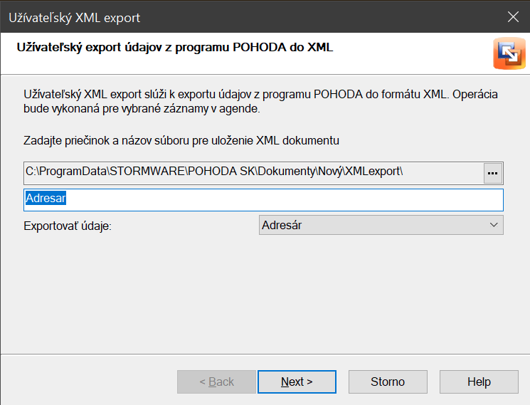 - Zadáte cestu a názov súboru, do ktorého chcete spraviť export. Pri možnosti Exportovať údaje vyberiete Adresár. Nakoniec vyberiete typ exportu Štandardný export XML POHODA.