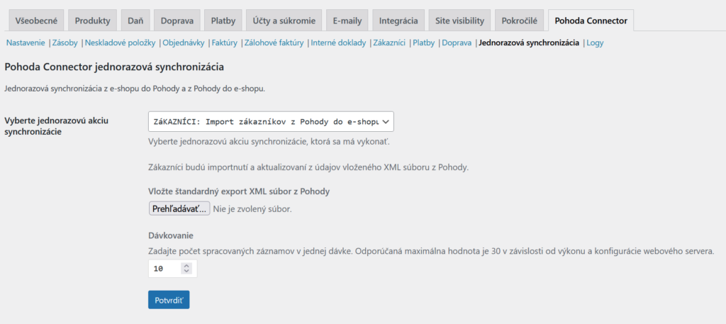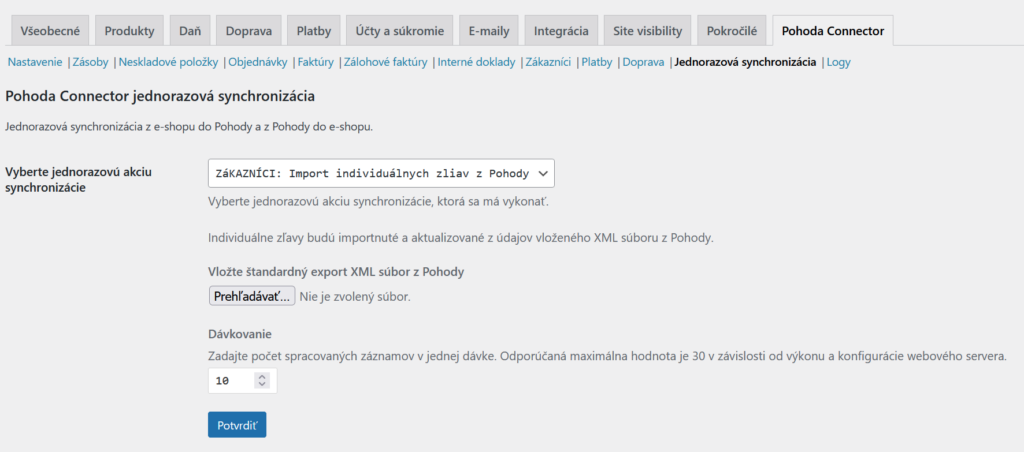 Jednorazová synchronizácia v našom plugine WooCommerce Pohoda Connector pracuje s XML súbormi. Buď ich generuje, alebo po vložení ich spracuváva. Dôležité je uvedomiť si, že spracovanie importu alebo exportu vychádza z nastavení synchronizácie v plugine (napr. podľa akej kľúčovej položky sa majú produkty synchronizovať, ktorá cenová hladina produktov sa má spracovať ako bežná predajná cena, apod.), preto odporúčame pred spustením importu/exportu preveriť si všetky nastavenia v našom plugine.