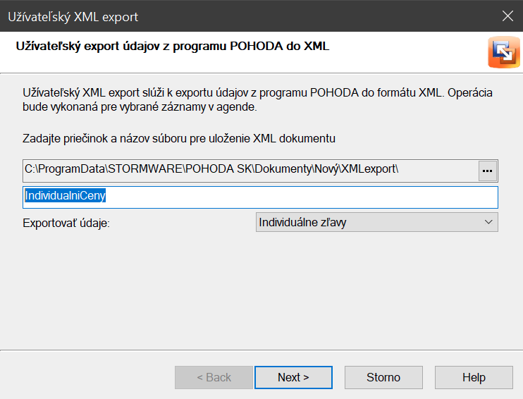 - Zadáte cestu a názov súboru, do ktorého chcete spraviť export. Pri možnosti Exportovať údaje vyberiete Individuálne zľavy. Nakoniec vyberiete typ exportu Štandardný export XML POHODA.