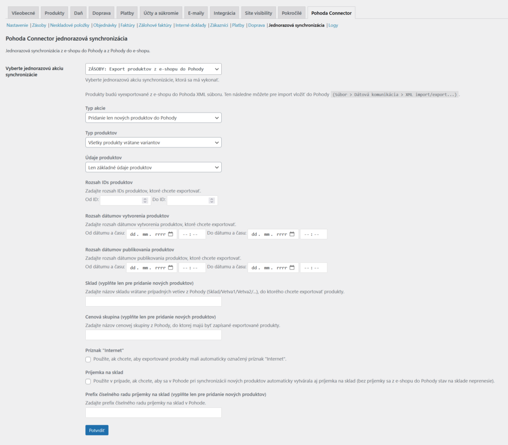 Primárnym cieľom jednorazovej synchronizácie je umožniť jednorazovo, resp. operatívne prenášať veľké množstvo dát z Pohody do e-shopu alebo opačne. Keďže pravidelná synchronizácia medzi Pohodou a e-shopom prebieha systémom server-to-server, rýchlosť a stabilita prenosu dát je zavislá na kvalite sieťovej infraštruktúry a na konfigurácii systémového prostredia webového servera, na ktorom beží e-shop. Ako príklad poslúži situácia, keď chcete z Pohody do e-shopu preniesť celú agendu Zásoby a celkový počet skladových kariet je vyšší ako 5 000. V takom prípade s najväčšou pravdepodobnosťou priamy export do e-shopu nezbehne celý a webový server proces „vytimeoutuje“ (pokiaľ používate štandardný sharing webhosting, alebo VPS server máte nasetupovaný s určitými obmedzeniami a limitmi).