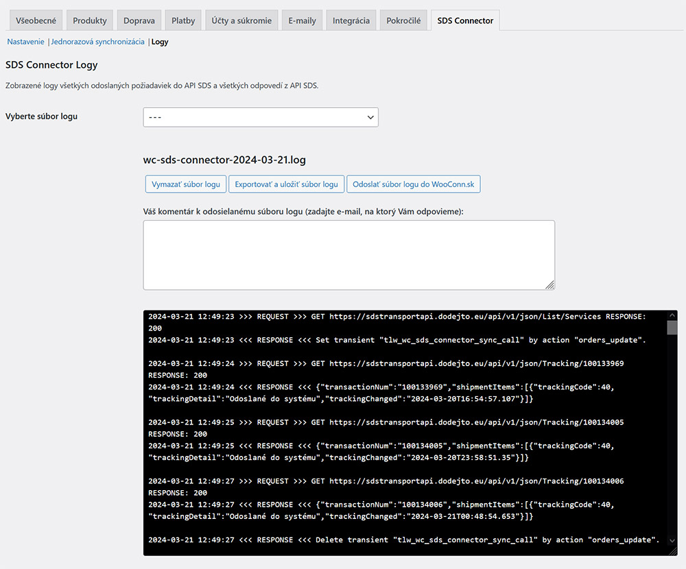 V rámci rozhrania pluginu sú zobrazované logy synchronizácie medzi e-shopom a API SDS.
