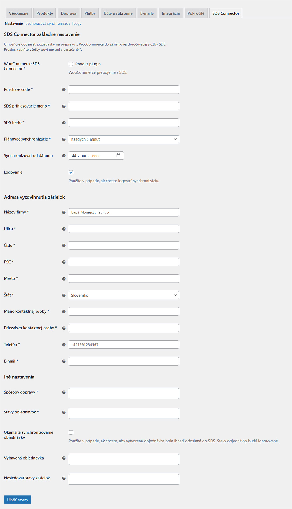 4. Nastavenia pluginu nájdete tu: WooCommerce > Nastavenia > záložka SDS Connector.